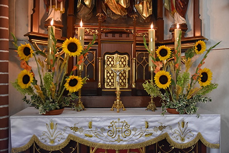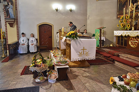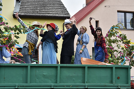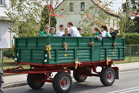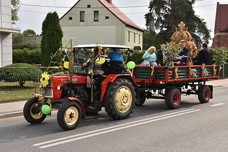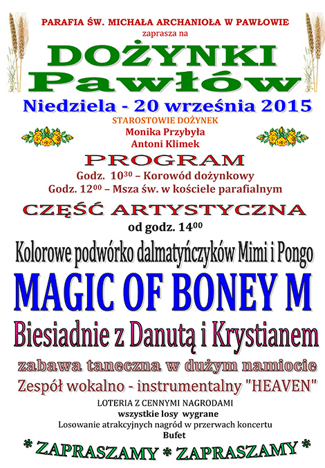 Uroczystość Dziękczynienia za tegoroczne żniwa świętowaliśmy w tym roku przy pięknej pogodzie. Lato zresztą było niezwykle upalne i wszyscy wyczekiwali deszczu. Nawet, gdyby w Dożynki lało, nikt by się chyba nie zżymał na niepogodę. Msza św. o godz. 12.00 poprzedzona była korowodem dożynkowym, który wyruszył o godz. 10.30 z placu przy probostwie, był wyjątkowo kolorowy. Wieś była bardzo pięknie udekorowana. Po Mszy św. odbył się festyn dożynkowy, na którym wystąpiły zespoły: KOLOROWE PODWÓRKO DALMATYŃCZYKÓW MIMI I PONGO, MAGIC OF BONEY M, BIESIADNIE Z DANUTĄ I KRYSTIANEM. Konkursy dożynkowe z cennymi nagrodami, zuzka, smaczne kiełbaski, steki, bigos, zimne napoje, frytki i na koniec zabawa taneczna przy akompaniamencie zespołu HEAVEN do godz. 2.00 – to wszystko zgromadziło setki gości.